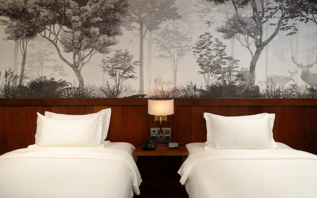 At 32 sqm, rooms are faced and open towards the centre of the hotel with natural light gleaming in through the central skylight facing artificial raindrop decor. Both twin bed and king bed options are available.
