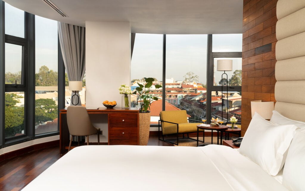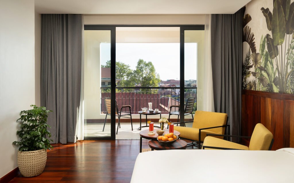 This sizable rooms at 38-46 sqm features an accessible balcony overlooking the bustling main streets of Siem Reap CBD. Both twin beds and king size beds available.